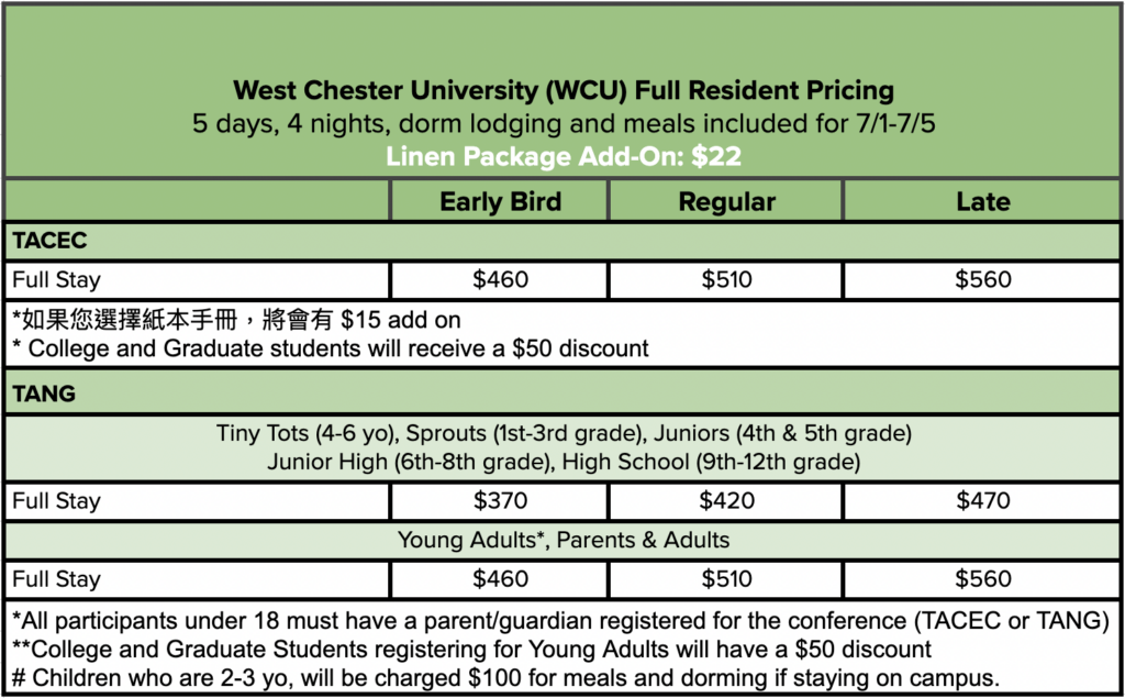 如何報名: 請在填完每一份申請表後,點擊 「Add Registrant」(新增報名者) 而非「Finish and Pay」(完成並付款),以便同時為所有家庭成員報名。請確保為每一位參加年會的家庭成員進行註冊,包含 4 歲以下 的幼童。